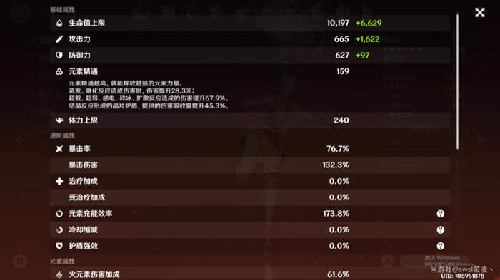 这是吃到宗室4件以及班尼特大招的香菱 由于我的香菱装备了:决斗之枪(90级454攻击力)充能沙漏、火杯子,攻击力加成只有决斗之枪,给的16/24百分比攻击力加成所以说,攻击力越低班尼特带来的固定攻击力的伤害收益收益就越大