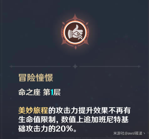 一命:冒险憧憬 美妙旅程的攻击力提升效果不再有生命值限制,数值上追加班尼特基础攻击力的20%,有很多人就在想是不是一命了就可以奶满了?答案是NO! 实际效果是:q技能范围内,血量低于70%以下会继续回血,直到血量超过70%,但是70%以下可以享受攻击力加成,之前是不享受的