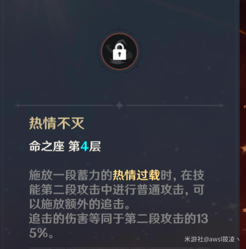四命:热情不灭 释放一段蓄力的热情过载时,在技能第二阶段中进行普通攻击,可以释放额外的追击。 追击的伤害等同于第二段攻击的135%。 这命就相当于在班尼特大招里不会被自身击飞了一样但是伤害比二段蓄力低一丢丢