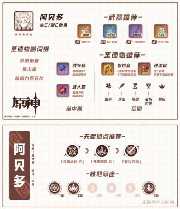 《原神》是由上海米哈游网络科技股份有限公司制作发行的一款开放世界冒险游戏,于2017年1月底立项,原初测试于2019年6月21日开启,再临测试于2020年3月19日开启,启程测试于2020年6月11日开启,PC版技术性开放测试于9月15日开启,公测于2020年9月28日开启。 原神1.2版本已经更新,那么在当前版本各个角色该如何选择武器和圣遗物呢?下面一起来看看原神1.2版全角色武器、圣遗物搭配推荐吧。 原神1.2版全角色武器、圣遗物搭配推荐 ★五星角色搭配推荐★ 阿贝多