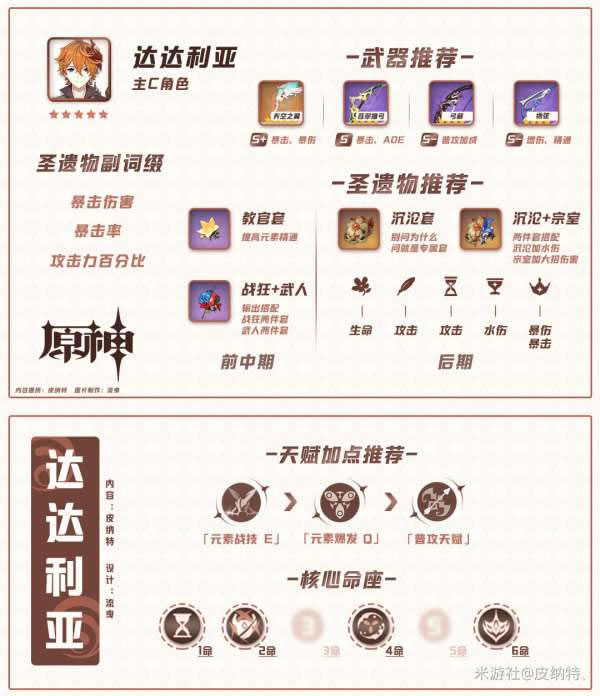 阿贝多这里黎明神剑给S+要说一下为什么 因为黎明神剑的被动(5精炼90%血以上增加28%的暴击并且副属性是暴击伤害) 所以在后台的时候阿贝多也是会有暴击、暴伤的加成, 阿贝多的E技能刹那之花是吃得到阿贝多的“暴伤、暴击、岩属伤以及防御” (不吃攻击力!不吃攻击力!) 这把武器可以说副C性价比超过五星(辅助副C的情况下)所以并不是给错了哦~ 达达利亚