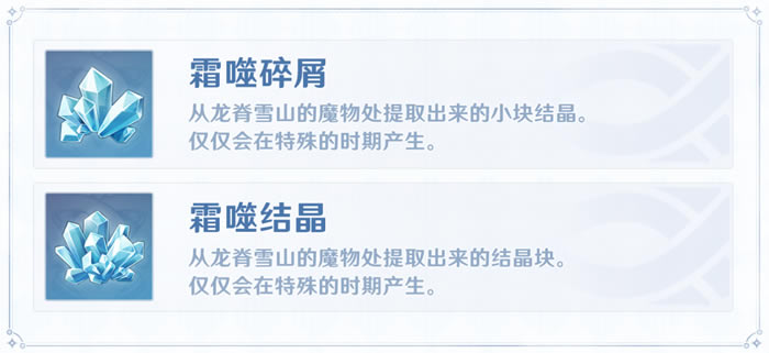「第一幕」开启后,旅行者们击败「龙脊雪山」地区的魔物会掉落「霜噬碎屑」和「霜噬结晶」。