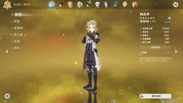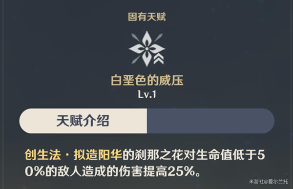 其次,自带天赋一“白垩色的威压”所能给予的伤害提升也较为优秀,建立在防御力非常容易附带的情况下,配合上阿贝多自带加成的岩元素伤害提升收成也是非常突出的。