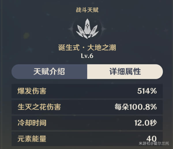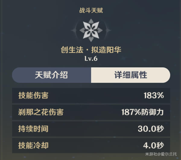 阿贝多的元素战技“创造法.拟造阳华”只要存在场上,平均每两秒造成一次伤害就能触发一次刹那之花。算上第一次刚释放时不能触发,如果能够打满那么理论上能够打出15次刹那之花的伤害。小爱的阿贝多是0命,6级的情况下刹那之花已经有187的倍率,如果全部打满那么收益还是相当惊人的。