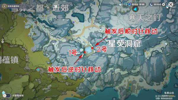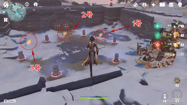 ▲仙灵位置及编号 这里就是第一层机关,我们要利用这2个温暖仙灵来解锁4个遗迹之烛。方法为首先触发其中任意一个温暖仙灵,在其移动至与第二个温暖仙灵重合时,立即触发第二个温暖仙灵即可。 这里我首先触发了2号仙灵,在2号顺时针移动了半周,与1号重合时立即过去触发1号(反之同理),之后等待解锁完毕即可。(动图为2倍速快进) 第一层解锁完成后,下面是第二层机关,这次是6个遗迹之烛和3个仙灵,3个仙灵触发后均为顺时针旋转,经过的遗迹之烛会被短暂触发。那么可以看出,要想让6个遗迹之烛在某一时刻同时亮起,关键就在于要使这3个仙灵在移动时等距且平分整个圆的周长。这里给仙灵编号,方便与后面的配图结合查看。