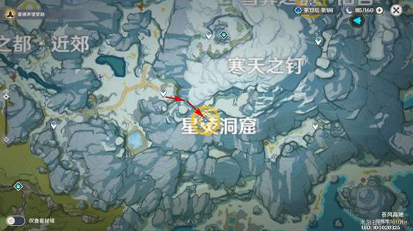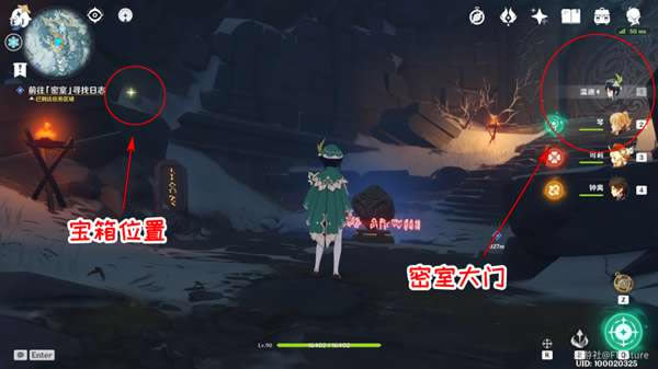 ▲学者史蒂文斯及位置 在给他看了这本日志后,他表示这是一份历史价值非凡的宝藏,可能是蒙德旧贵族向雪山派出的考察队所遗留下来的日志,并且希望旅行者可以再去雪山上搜索一下这些日志,在搜索前给我们标注了一些线索。于是,带着史蒂文斯在地图上做出的标注,我们开始下一步的探索。 ▌2.前往「密室」寻找日志 根据小地图指引,来到「密室」所在的位置,具体位置及路线如图所示(任务进行时选择追踪目标会有非常明显的方向以及距离提示,很好找)。