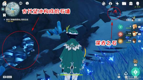 ▲「阳面的营地」位置及路线 沿路线飞进洞穴,就在快要接近任务点时,会看到一面古代坚冰构成的墙,任务点就在墙后,深赤之石也在其不远处,可以轻松拾取并融化。