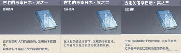 ▲古代坚冰及深赤之石位置 融化古代坚冰后来到后面的营地,在旁边的架子上可以找到最后一本日志「古老的考察日记·其之三」 ▌4.将收集到的日志交给史蒂文斯 拿到全部三本日志后,就可以回到营地寻找史蒂文斯对话并领取奖励了。至此,世界任务「覆雪之国」就全部完成了,有兴趣的旅行者也可以仔细研读一下三本日志,或许会有什么了不得的发现呢~