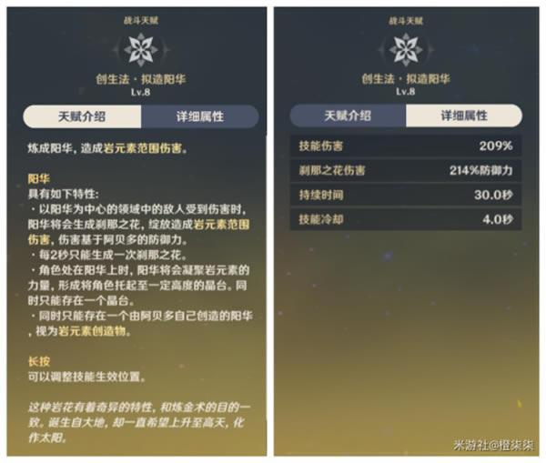 2、元素战技:创生法·拟造阳华 创造一个花状岩元素创造物,形成大范围圈型,造成岩元素范围伤害,在阳华领域中敌人受到伤害时会生成刹那之花,绽放造成岩元素伤害,伤害基于阿贝多防御力,站在阳华上可形成一个晶台,托起角色至一定高度。 长按可调整技能生效位置,技能冷却CD4秒,持续时间30秒,但仅能同时存在一个。 解析:主要是作为工具技能,敌人受到伤害可以伴随刹那之花攻击(切换队友也行),大招在阳华范围内释放也获得加强,也可以搭配钟离的技能共鸣。