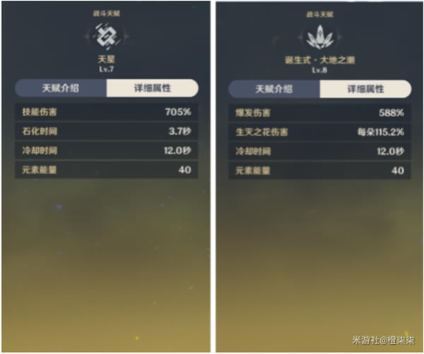 3、元素爆发:诞生式·大地之潮 在前方造成大范围岩元素伤害。 若在拟造阳华范围内释放,则会伴随着七次生灭之花的绽放伤害(在阳华范围内炸七次,爆炸位置分散,并不是定位敌人爆炸) 冷却时间12秒,需要元素能量40 解析:阿贝多的主要输出技能,和钟离类似,均是12秒CD,均是40能量,瞬间爆发倍率没有钟离高,后续的七次生灭之花爆发伤害较强(但不是每一个都可以炸到······)。消耗能量较低,只有CD限制了大招的释放~~ 下图是钟离的天星和阿贝多的大地之潮对比
