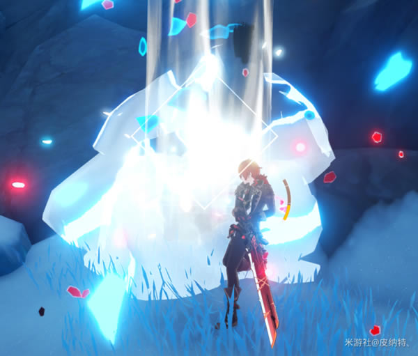 然后最重要的一点,雪山内的冰很多都是无法融化的,比如要在周围找到这种矿“忘了叫啥了突然”击碎之后身上会有红色的特效,这个时候走到碎片就可以直接打掉1/4血(其他冰的障碍也可以用这个击碎)