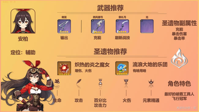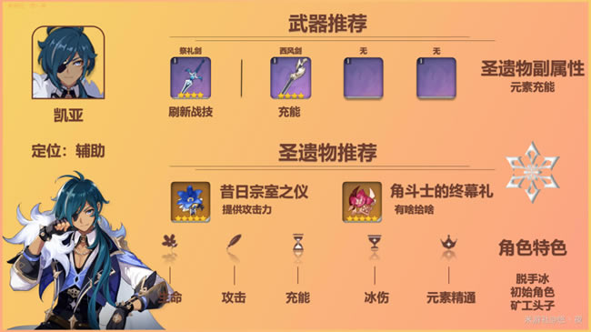 战技和爆发,冰元素附着CD短,不需要太多资源也是可以在深渊一战。 由于没有冰套,只能用一些万金油的套装勉强凑合,如果不想单独为凯亚刷圣遗物, 教官(提供元素精通)、流放者(元素充能)、学士(元素充能辅助弓、法器)比较好的圣遗物装备上也不错。 七七