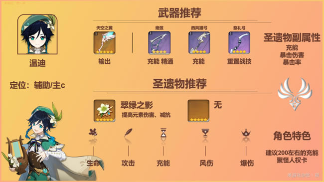 对群聚怪减抗,功能性最强,飞天爬墙,无所不能。 对于元素充能的建议,武器是元素充能则,沙漏是精通,反之,武器是精通,沙漏是充能 对于大佬们的可以抛弃主属性充能,转为副属性累计起来。这需要大量的资源,慎重考虑。 建议200充能是俩元素战技充满元素爆发,实际情况还要看个人了,充能用的舒服就行,如果队伍是双风,可以降低要求。 迪卢克