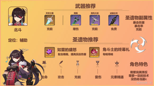 当个副c,还是很舒服的,给点充能开大脱手。 获得的圣遗物魔女和渡火,属性好的可以给香菱,配合主c打输出。 北斗