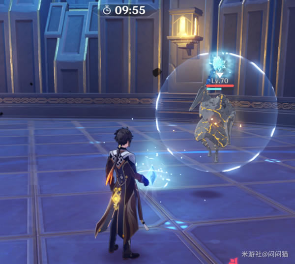 元素爆发是简单粗暴的一个技能。对范围内敌人石化,高倍率的技能伤害。12秒的冷却时间,所需元素能量只要40,1级的石化时间为3秒,每级递增0.1秒,10级为4秒的控场时间。我们可以对比温迪的风神之诗(冷却15秒,持续8秒,所需元素能量60)所以我们可以适当地为钟离选取元素充能词条的圣遗物或武器就可以实现频繁释放大招。 石化与带元素盾怪互动效果:
