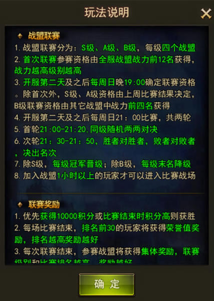 奖励丰富 神兵武器、翅膀材料 除S级联赛,其他级别冠军晋级;除B级,每级末名降级。值得注意的是,加入战盟1小时以上的玩家才能进入比赛。在比赛过程中,优先获得10000积分或比赛结束积分高的战盟方获胜,随后根据玩家排名发放个人奖励与集体奖励。其中奖励更有神兵“大天使之剑”和稀有翅膀材料!