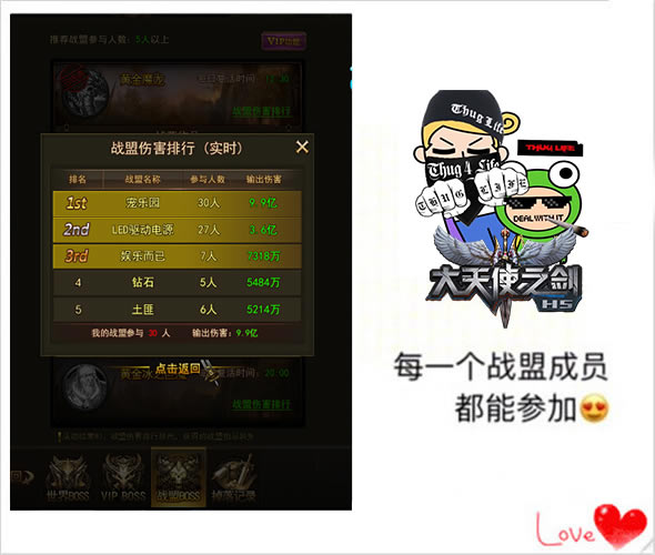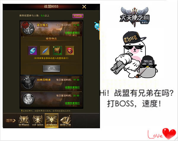 秘诀小技巧:机智的玩家,通过来回加入/退出战盟,竞拍其他战盟的掉落物品,心机ing……。 了解了《大天使之剑H5》战盟BOSS的玩法规则,快和小伙伴一起建立属于你们的强大战盟吧。