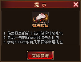 除妖进行时 1、在御法除妖活动界面可看到已刷新的活动BOSS,点击BOSS下的筋斗云即可传送至BOSS场景。参与击杀BOSS可获取丰厚奖励,奖励将会以邮件的形式发放。