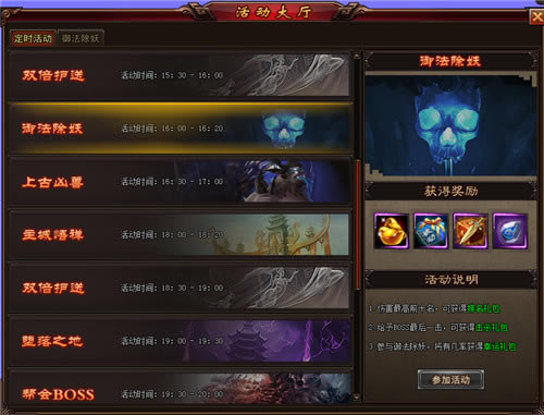 网页游戏顾名思义就是基于Web浏览器的网络在线多人游戏。在线分享网页游戏资讯 《大话女儿国》御法除妖攻略。 . 若不能习得普渡苍生之法,唯有紧握手中剑,哪怕三界颠覆,吾等仍能仗剑除妖! 御法除妖 “御法除妖”为每日定时活动,活动开启时可通过界面右下角的活动提示面板进入活动界面。或者界面右上方的“活动大厅”,在活动大厅直接点击定时活动中的“御法除妖”然后点击参加活动,或者点击面板上的“御法除妖”都可看到活动界面。