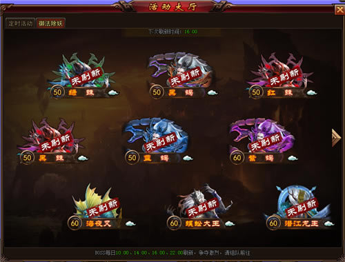 3、御法除妖活动每日可参与四次,开启的时间分别是10:00、14:00、16:00、22:00。活动BOSS也将于每次活动开启时刷新。 4、活动BOSS争夺激烈,最好组队前往。 |