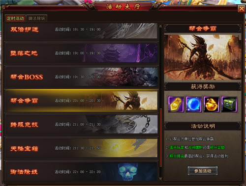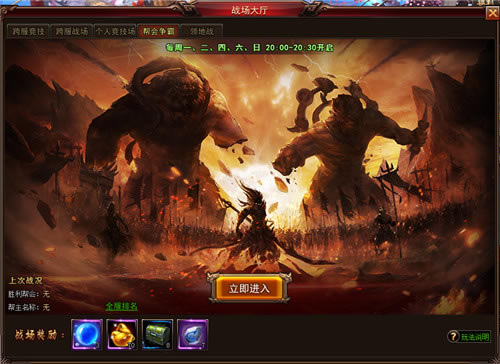 1.活动时间:20:00~20:30 2.每个有帮派的玩家都可以参加活动 3.每个玩家都有一个自己的积分,积分达到不同的阶段可获得相应的奖励 4.同一帮派的所有玩家积分相加则为本帮派的积分,帮派积分用来决定最后的帮派排名 5.排名第一的帮主可获得一个24小时的限时称号 6.每周二、周四排名前十的帮会可获得参加领地战的机会。 战斗开始