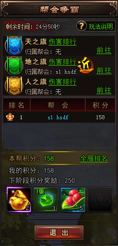 积分排名规则 1.攻击战场旗帜每次可获得1积分 2.战场旗帜被摧毁之后根据帮会伤害排名,给予不同的积分 3.伤害最高的帮会为占领帮会,全体成员每10秒获得20积 4.击杀敌对玩家可获得15积分 5.助攻可获得3积分 胜负规则 1.所有帮派成员积分相加,每秒更新一次帮会积分 2.活动结束时,根据帮派积分排名分出名次 3.获得结束后可根据帮会排名获得相应礼包奖励 4.活动结束后积分第一的帮会获得胜利