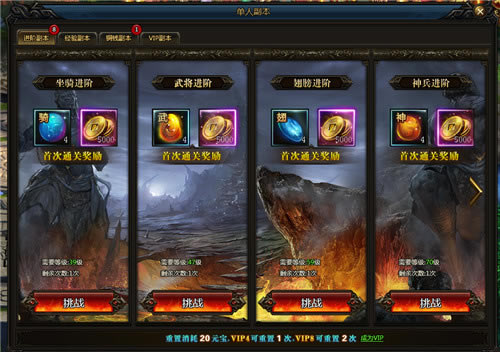 三、副本内容 1.进阶副本每天可挑战一次,称为VIP并消耗一定的元宝能获得挑战机会。 2.不同进阶副本需要满足挑战等级才能进行。 3.首次通关可以获得额外的奖励,并随机获得仙丹、灵丹等道具。 4.进入副本后,在规定的时间内完成通关条件并击杀boss,可获得额外奖励。 PS:资料取自自测服,详情以游戏为主。 《操戈天下》运营团队 |