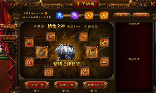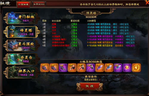 打宝秘境是游戏中资源最为丰富的地区了。玩家可以进入传灵塔来打宝获取装备。相对于世界挂机而言,这里的装备品阶更加优良,属性的加成也会更高。当然,进入的条件也相对较高,玩家坐骑至少达到2阶才能进入传灵塔。 对于掉落60-80橙装的神界入口,玩家至少要达到60级才能进入。其中装备的丰厚程度也是让人垂涎三尺! 斗罗密藏: