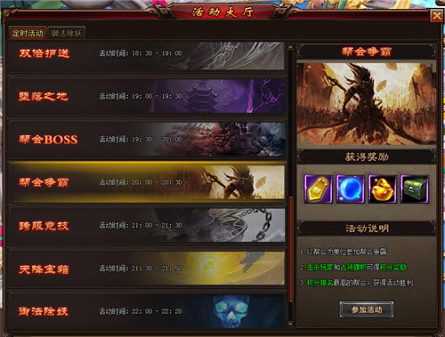网页游戏顾名思义就是基于Web浏览器的网络在线多人游戏。在线分享网页游戏资讯 《暗黑神话》帮会争霸。 . 一朝成战友,生死一家人! 为自己,为了帮会而战! 每周一、二、四、六、日20:00开启活动。活动开始后,会在界面右下方弹出提示面板,点击即可打开活动页面,也可通过“活动大厅→定时活动→帮会争霸”打开活动界面。