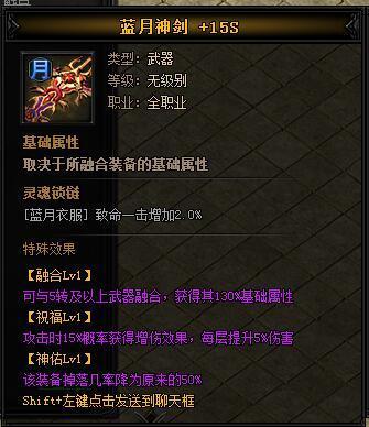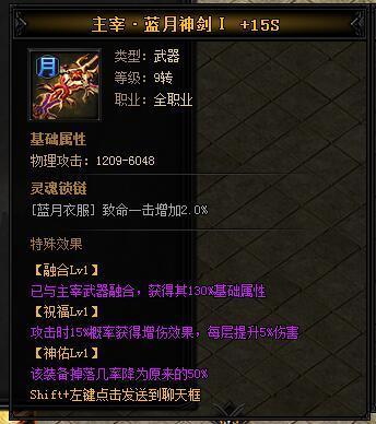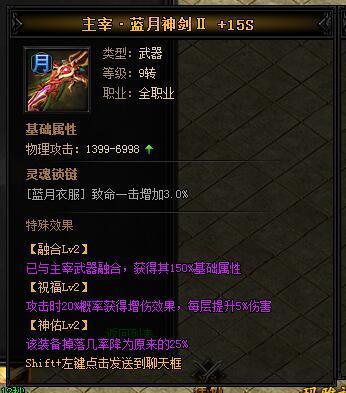 http://img1.ali213.net/webgamepic/uploadfile/news/2017/02/23/aliali1487819105372.jpg 按照上述公式,就能合成主宰·蓝月神剑II,下面再让我们看一下它有哪些独特的属性和特殊效果吧。 主宰·蓝月神剑II。类型:武器,等级:9转,职业:全职业。基础属性——物理攻击:1399-6998。灵魂锁链——【蓝月衣服】:致命一击增加3.0%。特殊效果——【融合Lv2】:已与天龙武器融合,获得其150%基础属性。【祝福Lv2】:攻击时20%概率获得增伤效果,每层提升5%伤害。【神佑Lv2】:该装备掉落几率降为原来的25%。