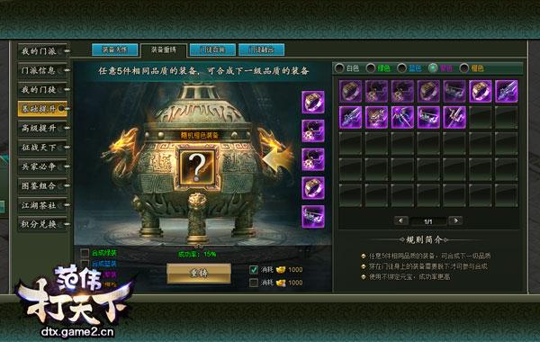 网页游戏顾名思义就是基于Web浏览器的网络在线多人游戏。在线分享网页游戏资讯 哥们网《范伟打天下》新版攻略之门徒装备重铸。 . 在哥们网《范伟打天下》,装备对于门徒来说是非常重要的!不过值得一说的是《范伟打天下》极品门徒装备玩家也不需要花费元宝购买,只要重铸即可。 哥们网《范伟打天下》新版攻略之门徒装备重铸,一起来看下吧。