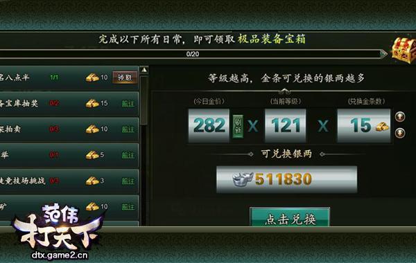 玩家通过完成各项日常任务,可以根据难易程度获得数量不一的金条奖励,使用金条可以根据当日金价以及玩家当前等级兑换银两。根据兑换公式可以发现,玩家要尽量在高等级且高金价的时候进行兑换最划算,那么也就是说玩家可以一直囤积金条,直到满级吗? 在实际情况下这是不划算的,因为玩家携带金条的上限为500个,当金条数量达到上限后新的金条就会溢出消失,所以玩家最好的金条兑换办法就是合理规划兑换时机。由于金价会在200-300之间进行浮动,所以当玩家看到金价高于280时就可以准备进行兑换了,在兑换当天把等级尽量升高即可。 以上就是哥们网《范伟打天下》新手攻略之打金条玩法,根据合理的规划兑换到足够多的银两,你就能愉快的点技能不愁没钱啦!