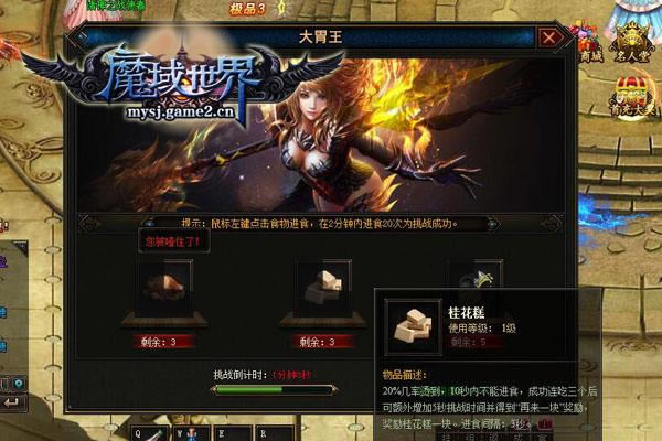 网页游戏顾名思义就是基于Web浏览器的网络在线多人游戏。在线分享网页游戏资讯 吃货的春天 《魔域世界》大胃王等你挑战。 . 哥们网《魔域世界》有一个十分好玩的游戏叫做大胃王,比拼的就是吃东西的技巧以及速度。各位标榜吃货的玩家是否有每天都来挑战一下呢?知己知彼百战不殆,今天小编给大家带来大胃王的详细攻略,今后天天都可以进行挑战。