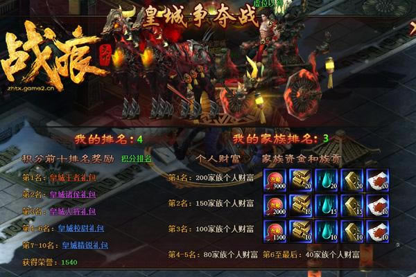 网页游戏顾名思义就是基于Web浏览器的网络在线多人游戏。在线分享网页游戏资讯 无惧生死 《战痕天下》皇城争夺战秘籍来袭。 . 哥们网《战痕天下》的皇城争夺战于每周的二、四、六20:30-21:00准时开启,届时只要加入帮派的玩家都可以前往参加到哥们网《战痕天下》这场逼格较高的活动中。 一、首先,让我们先看一下这场活动的奖励规则: 1.对于家族来说,积分排名前十的家族可以领取皇城礼包,排名越高,礼包的品质越好。 2.对于玩家个人来说,积分越高,获得的家族资金和族贡越多、荣誉值越高。但只要是参与活动的玩家都能获得一定的奖励。 3.家族族长还有可能获得龙辇和称号。 如何加入这场激烈的PVP活动中呢?