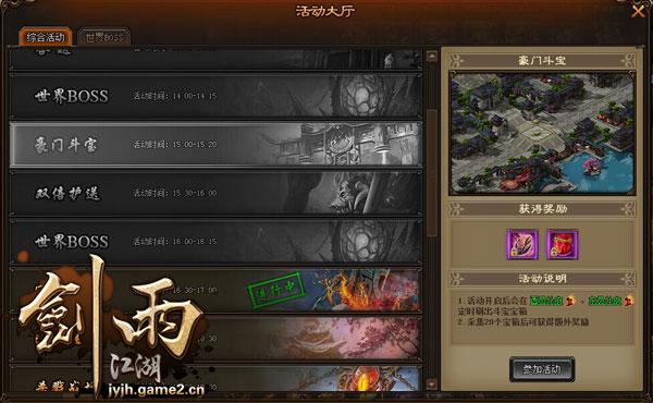 网页游戏顾名思义就是基于Web浏览器的网络在线多人游戏。在线分享网页游戏资讯 《剑雨江湖》豪门斗宝秘籍 本宝宝有小情绪了。 . 哥们网《剑雨江湖》豪门斗宝是东西员外豪爽大手笔,免费送出大量宝贝,而宝箱随机可以开出战骑技能书、法器技能书、神兵技能书、仙羽技能书等等。想要宝贝的玩家们,走,一起来参与哥们网《剑雨江湖》豪门斗宝吧! 1.如何参与 每天的15:00-15:20和21:30-21:50两段时间内直接点击参加活动传送到东西员外家的大院。