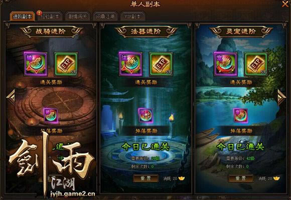 1.升级 哥们网《剑雨江湖》法器等级越高,带来的战力加成越大!而升级需要消耗法器进阶丹,玩家在游戏中获取进阶丹的途径有: (1)法器进阶副本 (2)声望商店积分兑换 (3)商城购买
