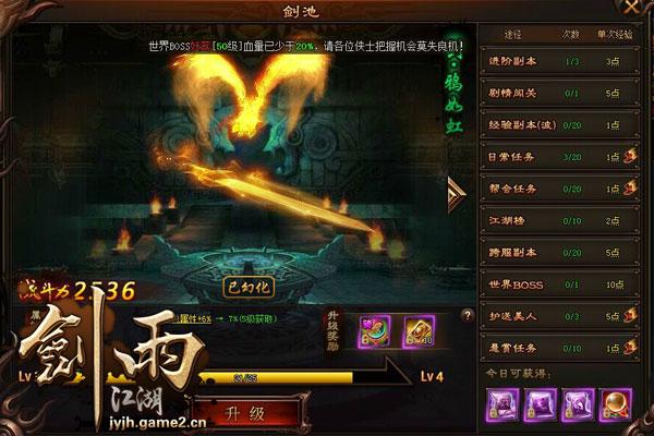 网页游戏顾名思义就是基于Web浏览器的网络在线多人游戏。在线分享网页游戏资讯 装逼炫酷必备 《剑雨江湖》剑池升级秘籍。 . 激活哥们网《剑雨江湖》的剑池系统,将会有上古守护兽跟随左右,为角色带来强大的战力加成!随着剑池的升级,守护兽的外观和数量、为角色加成的属性,就会有更加显著的变化。 那么哥们网《剑雨江湖》剑池如何升级呢? 答案就是:获取更多的剑池经验!