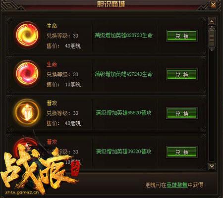 2.兑换 直接花费胆魄兑换胆识,兑换的胆识均为金色或者橙色品质。 3.购买 花费100元宝进行高级鼓舞,必出紫色胆识,有机率获得橙色胆识。 温馨提示:在游戏中,攻击和防御是基础属性,建议玩家穿戴胆识的先后顺序为:普攻>属攻>生命>防御>暴击>命中>坚韧>闪避>火防、风防、雷防