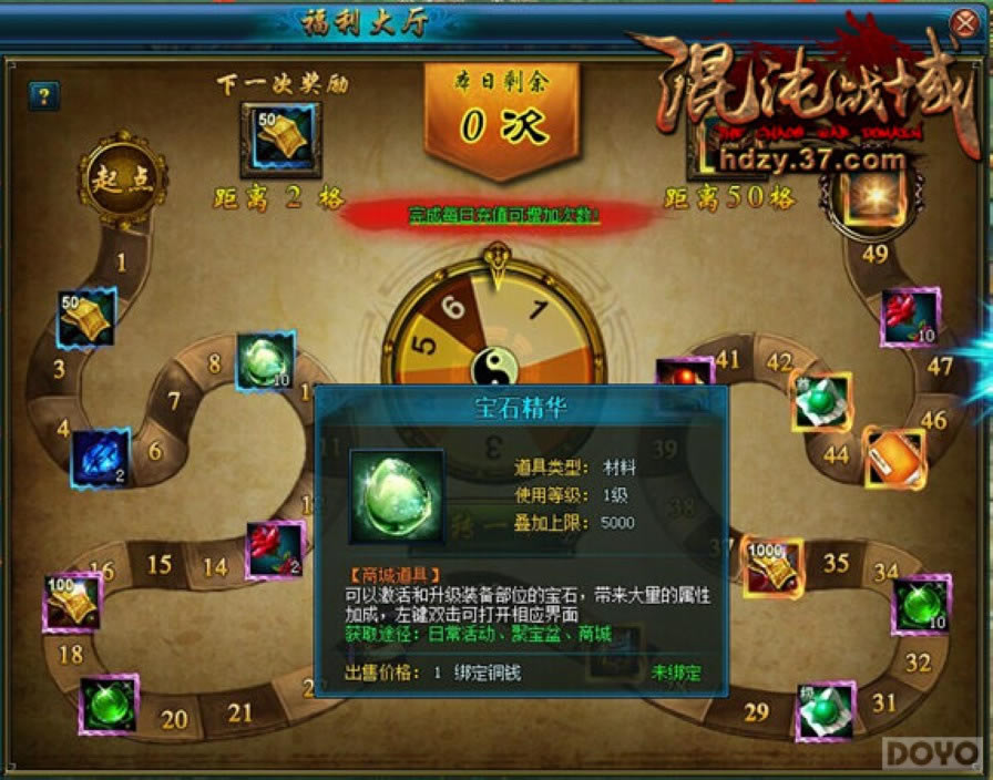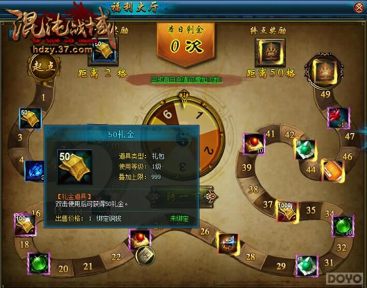 棋盘中的第二步为获取50礼金(双击之后可以直接获取,礼金可以在礼金商店中购买各种物品)。棋盘中的第五步为获取强化石2个,强化石可以在锻造界面培养装备,装备的强化是37《混沌战域》中的重头戏,强化装备不仅需要强化石,还需要一定的银两,强化石还可以通过日常活动和聚宝盆活动获得。
