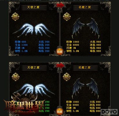 翅膀升阶:37《暗黑世界》中翅膀可以通过消耗“神之泪”进行升星和升阶,升阶后的翅膀可以永久获得更酷炫的外观。每个翅膀需要升星5次,升星后会获得永久的“攻击属性”提升,下图便是翅膀升阶前后属性的变化(蓝绿对比)。当翅膀升满5星后,就可以自动升阶为更高级的翅膀!解锁更华丽的翅膀外观!
