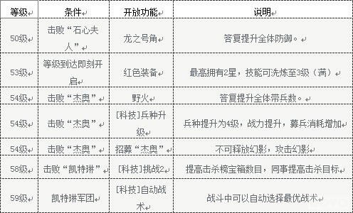 与之前的等级阶段相同,在37《怒火燎原》中如果玩家等级达到50级,也会有这一阶段需要特别关注的游戏功能,这一阶段最关键的游戏功能包括龙之号角、红色装备、野火、新武将以及新科技技能的提升,具体用途参照上图所示。 其中需要特别关注的是红色装备,红装最高2颗星,每个技能可洗炼至3级(满)。当出现2个相同的3级技能时将激发隐藏技能。洗炼出隐藏技能的红装可大幅提升武将属性。根据自身情况使用免费洗炼+至尊洗炼来提升技能等级。