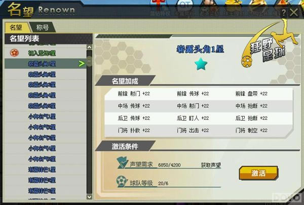 【名望系统玩法】 打开页面后默认显示名望分页 名望级别为唯一的单线结构,每个玩家在某个阶段只可能同时拥有一个名望级别 名望级别加成的属性项目和数值,都是不断增加,向下兼容的,越高越好 玩家激活下一阶段的名望后,自动更换为最新的属性加成 左侧是名望升级体系,列表形式存在,划分为默默无闻(1-5星)--崭露头角(1-5星)--小有名气(1-5星)--渐露锋芒(1-5星)--名声大震(1-5星)--享誉国内(1-3星)--洲际知名(1-3星)--世界级(1-3星),一共34个级别 右侧显示选中的名望级别的对应内容 最上面显示当前选中的名望级别名称,和对应的星星图表数量(最少1星,最多5星),此处注意,每个大的级别,最多有多少个星星,整个级别内都显示最大数量,当前星级不够的用空心的星星展示,例如:默默无闻3星,对应显示(★★★☆☆),世界级1星,显示(★☆☆) 中间显示名望加成的属性,属性加成对象为全队,此处填表实现(包括加成具体目标,属性条目,属性数值) 最下面显示该名望级别的激活条件(球队等级,球队声望)(声望从竞技场,天榜,联盟战等PVP模块产出) 激活条件不达标,激活按钮显示灰色,不可点击 激活条件达标,激活按钮正常可点击,点击后激活(累积性资源,不会被消耗) 已激活的名望,显示标签“已激活”