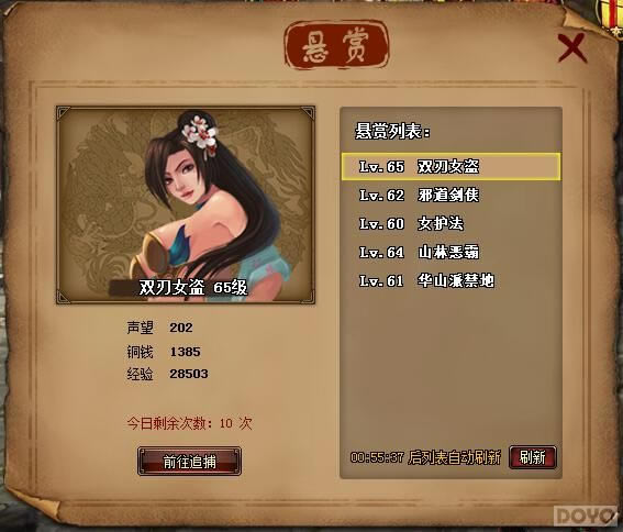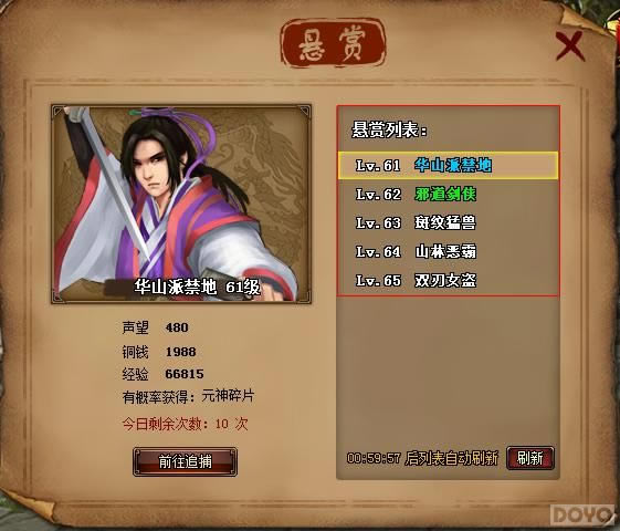 系统每天会刷新悬赏任务的可完成次数,一共10次,每1小时刷新,悬赏任务每次显示5个,每天最多完成10个。悬赏战斗玩法和普通战斗一致,完成悬赏任务可获丰富奖励,包括经验、铜钱、声望和元神碎片。