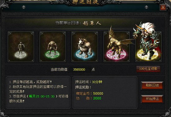 押送囚徒任务:玩家可在37《七杀》的土城NPC“押镖”处领取囚车,押送囚徒达到目的地后即可领取功勋和金币奖励,功勋值可用来提升功勋境界等级,还可以提升角色属性哦,赶紧来押送囚徒吧!囚徒品质越高,奖励越丰厚,囚徒品质可进行使用刷新符进行刷新!