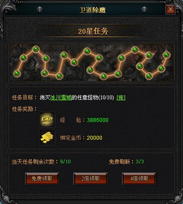 卫道除魔任务:37《七杀》卫道除魔任务为可刷新星级任务,最高为20星级,每次刷新消耗5W绑定金币,星级越高,奖励越丰厚哦,使用元宝可进行双倍和4倍领取! 境界任务:37《七杀》日常任务中的境界任务可以在土城NPC“境界任务”处进行领取,可使用“立即完成”功能快速完成任务,也可以在做完任务后使用元宝进行多倍奖励领取