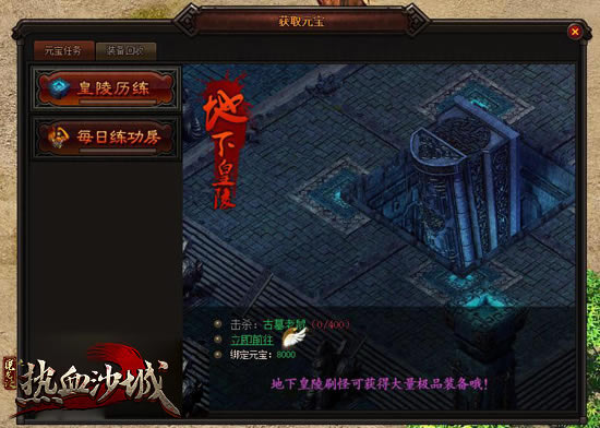37《魔龙诀》玩家背包中可回收的装备根据品质及等级分别出现在图中上下回收栏中,等级不低于65级,品质不低于蓝色的装备出现在下面的回收栏中,回收后获得元宝,其余不低于40级的装备出现在上面的回收栏,回收后可获得大量经验; 此外,除了装备回收,通过做任务也可以获得绑定元宝哦!玩家50级开启元宝任务,可以通过主界面右上角“获取元宝”的按钮打开“元宝任务”面板,进入活动地图击杀相应数量的怪物即可获得绑定元宝奖励哦~