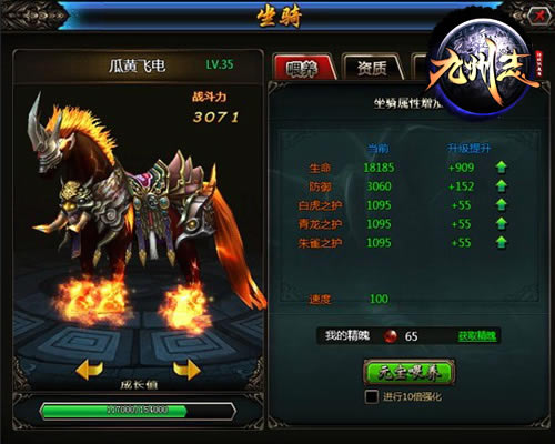 在37《九州志》中,坐骑的资质是可以升级的,坐骑的资质越高,给玩家带来的战斗力也越强悍,坐骑的资质升级需要使用资质丹,资质丹一般都是在宗派保卫战活动中进行获得,当然在这个系统中,大家也可以使用元宝对坐骑的资质进行提升,笔者认为元宝提升的优势更大一些,可以一次性将所有需要强化的属性提升5点,只需要15元宝,比较划算。