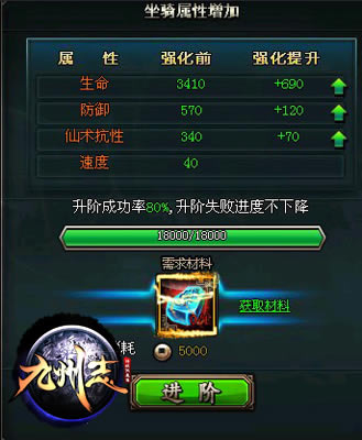 37《九州志》中的坐骑喂养可以为玩家提供大量的战斗力,这款游戏中的坐骑设置十分变化多端,而且外形霸气,大家骑着高等级的坐骑十分拉风,肯定吸引无数玩家羡慕的眼神,玩家的坐骑首先是需要使用精魄进行喂养,当坐骑的喂养值达到满格的时候,就需要使用坐骑进阶石进行进阶了,但是坐骑的进阶石有一定的成功几率的,当升阶失败的时候,升级的进度是不变的,但是坐骑进阶丹直接消失,所以各位玩家一定要特别的注意,坐骑进阶丹大家可以通过天将福神活动进行获得,获得难度一般,如果不够用可以在商城中进行购买。