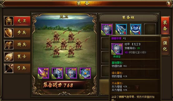 【兵种装备规则】 1.兵种装备分为6个部件:武器、头盔、铠甲、护腰、兵书、披风 2.每件装备属性由基础属性、强化属性、天命属性组成 3.不同部位的兵种装备对应不同的基础属性。 武器——物攻与法弓 头盔——法术防御 铠甲——物理防御 腰带——兵力 披风——最终免伤 兵书——最终伤害 【装备强化】 1.在兵种装备中打开装备背包可选择相应的装备进行强化 2.装备在强化后将按照装备的职业百分比增加对应职业的属性 3.使用强化石可以提高强化成功率