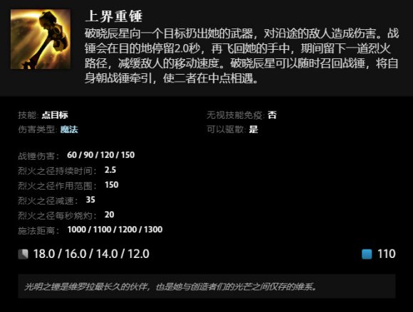 技能二:上界重锤 破晓辰星向一个目标扔出她的武器,对沿途的敌人造成伤害。战锤会在目的地停留2.0秒,再飞回她的手中,期间留下一道烈火路径,减缓敌人的移动速度。破晓辰星可以随时召回战锤,将自身朝战锤牵引,使二者在中点相遇。